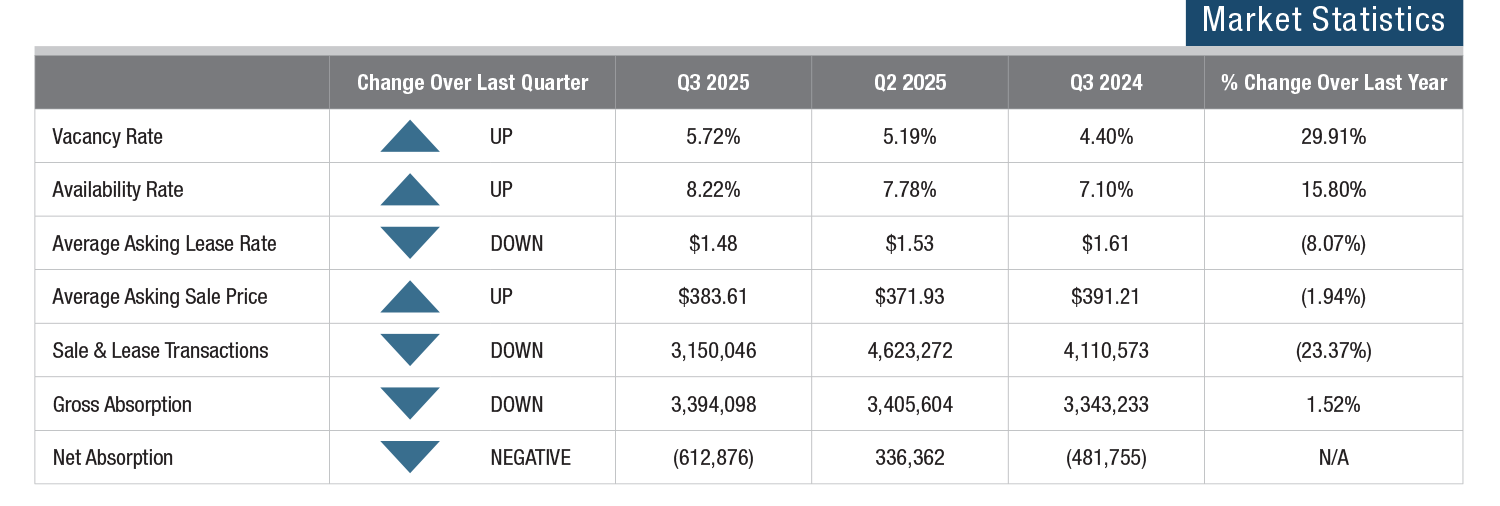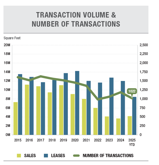 Transaction activity declined in Q3 2025, totaling 373 combined lease and sale transactions, down from 406 in Q2. Overall square footage decreased to 3,150,046 SF from 4,623,272 last quarter. Leasing accounted for most of the activity, with 271 deals totaling 2,326,657 SF, compared with 282 deals and 2,925,938 SF in Q2. Sales activity included 51 transactions, covering 823,389 SF, down from 62 transactions and 1,697,334 SF last quarter. Lower lease rates are beginning to entice tenants who had been sitting on the sidelines, while anticipated Federal Reserve interest rate cuts could revive investor activity and accelerate investment decisions in the coming quarters. Owner-user purchases continue driving sales volume as businesses prioritize operational control, with user acquisitions reaching record levels and representing 25% of the year-to-date transaction volume.